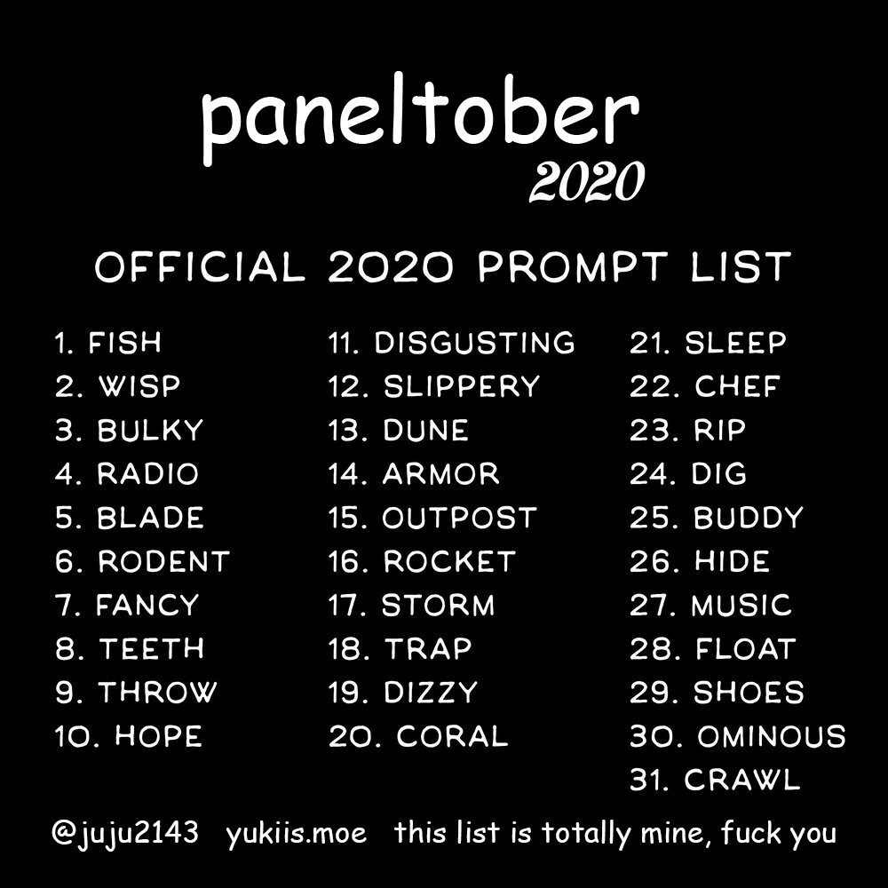 You probably know this meme where artists draw one drawing a day from a prompt list, and it’s called, uh, somethingtober? Yeah, let’s do the same thing this month. Paneltober. One panel a day, with a story to follow. Gonna be epic.